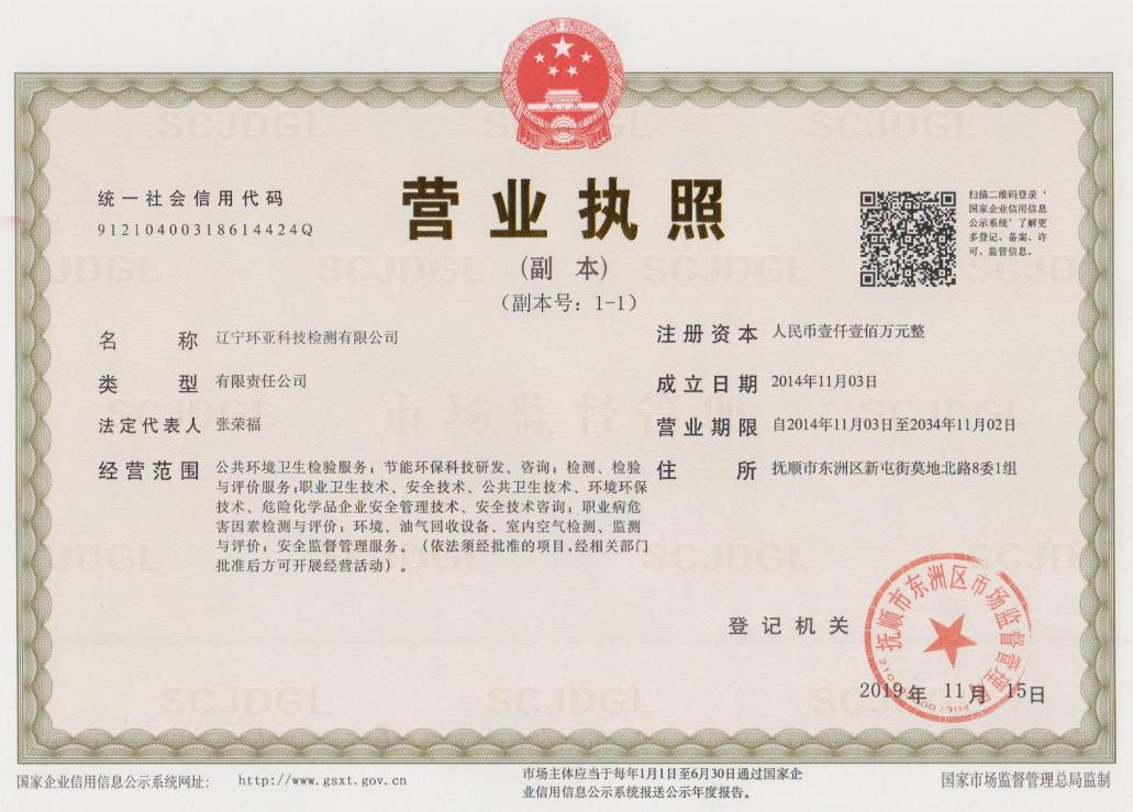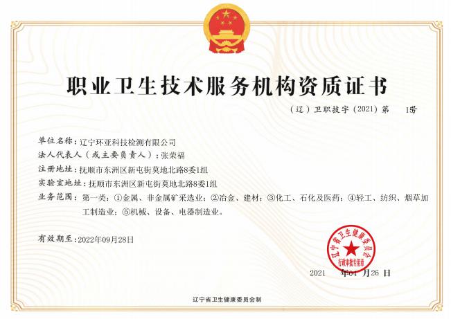 遼寧環(huán)亞科技檢測有限公司秉承“公平、公正、客觀、真實”的服務(wù)理念,力求為遼寧省各企事業(yè)等用人單位提供更優(yōu)質(zhì)的服務(wù),公司領(lǐng)導(dǎo)率領(lǐng)全體員工歷時一年零八個月的時間操練各項基本技能,于2016年8月9日取得了(遼)安職技字(2016)第B-0019號《職業(yè)衛(wèi)生技術(shù)服務(wù)機構(gòu)資質(zhì)證書》